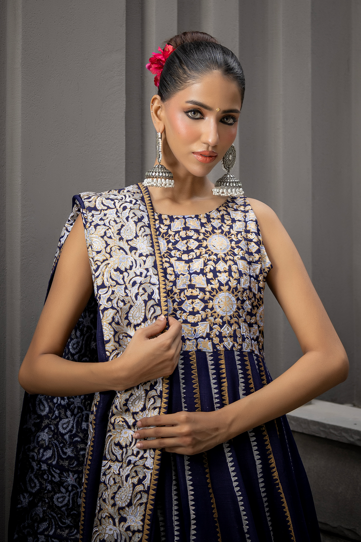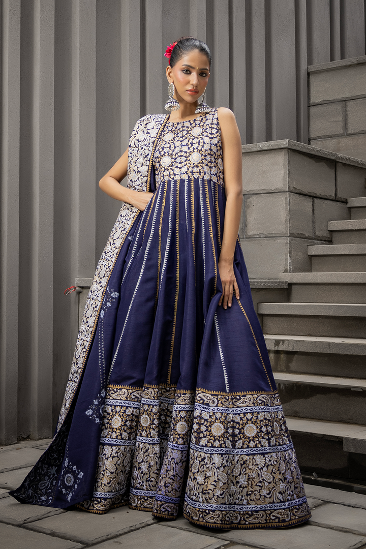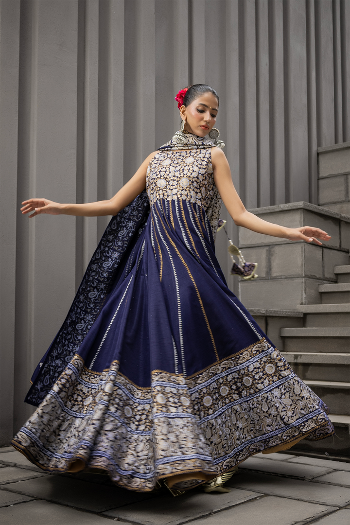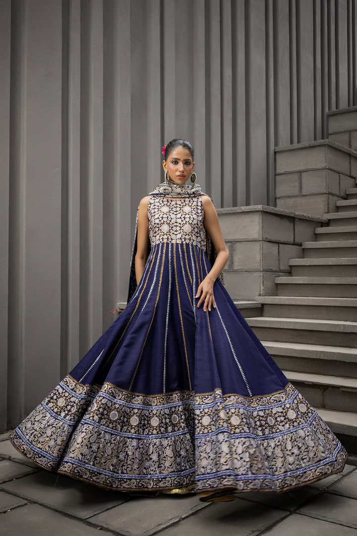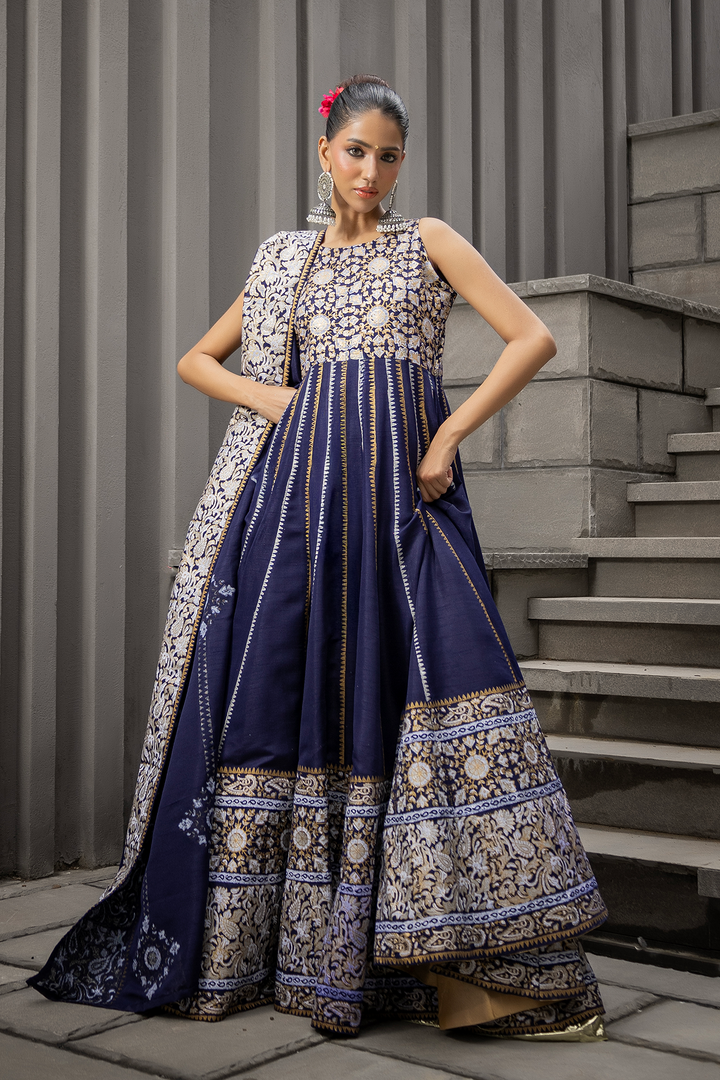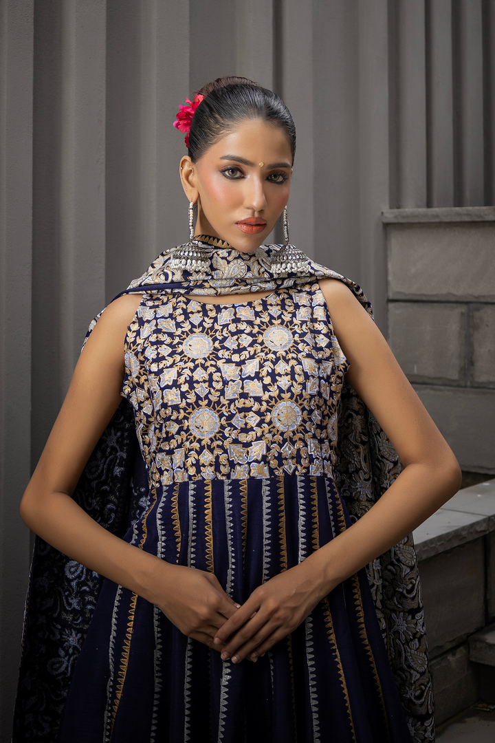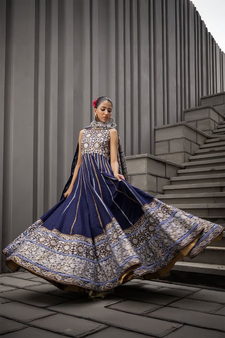 A striking navy katan silk Anarkali, elevated with intricate gold block print detailing. The flowing kalis create a dramatic silhouette, balanced by a dupatta finished with subtle accents. Paired optionally with cotton net loose flared pants finished with gota danek work at the bottom, this ensemble marries grandeur with quiet sophistication — crafted for evenings where presence speaks louder than words.