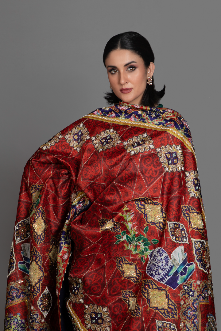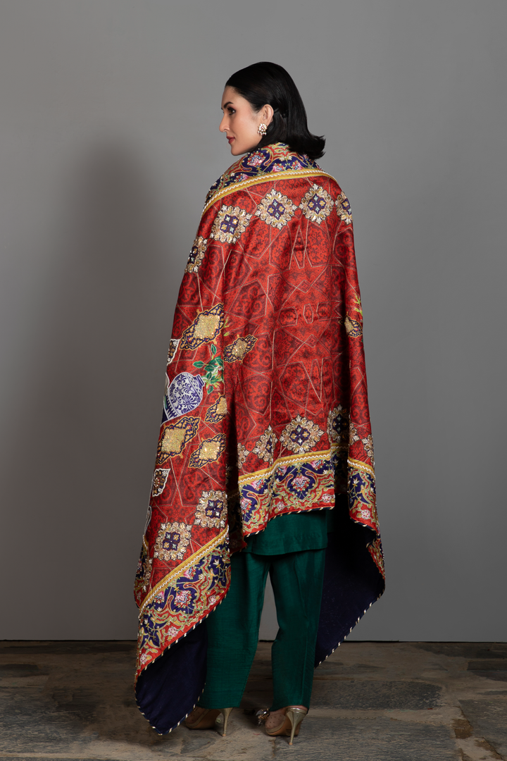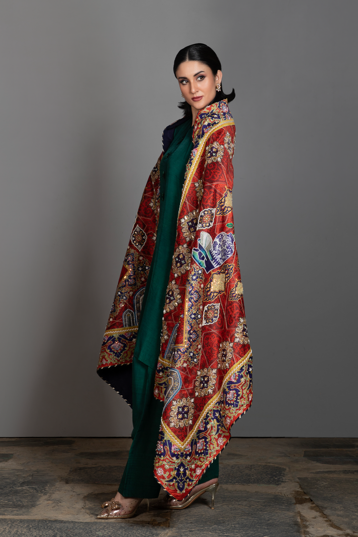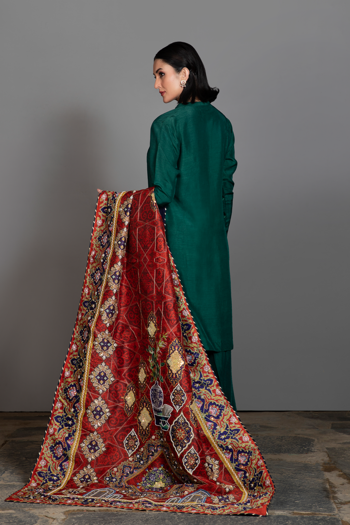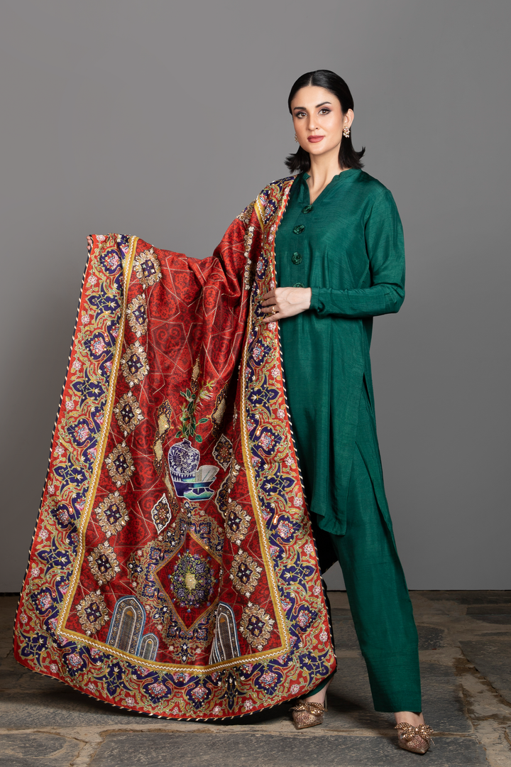Aasia pairs an emerald silk kurta and trousers with a striking red printed silk shawl inspired by Persian miniature art. The kurta features fine embroidered detailing along the neckline and sleeves, adding balance, refinement and a graceful finish.