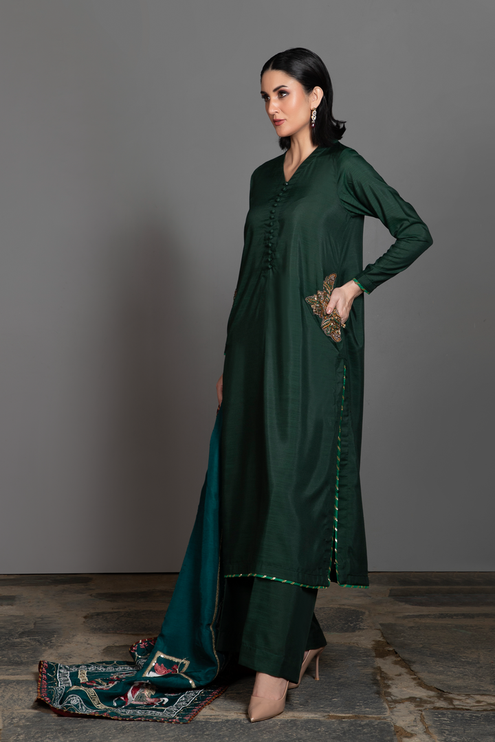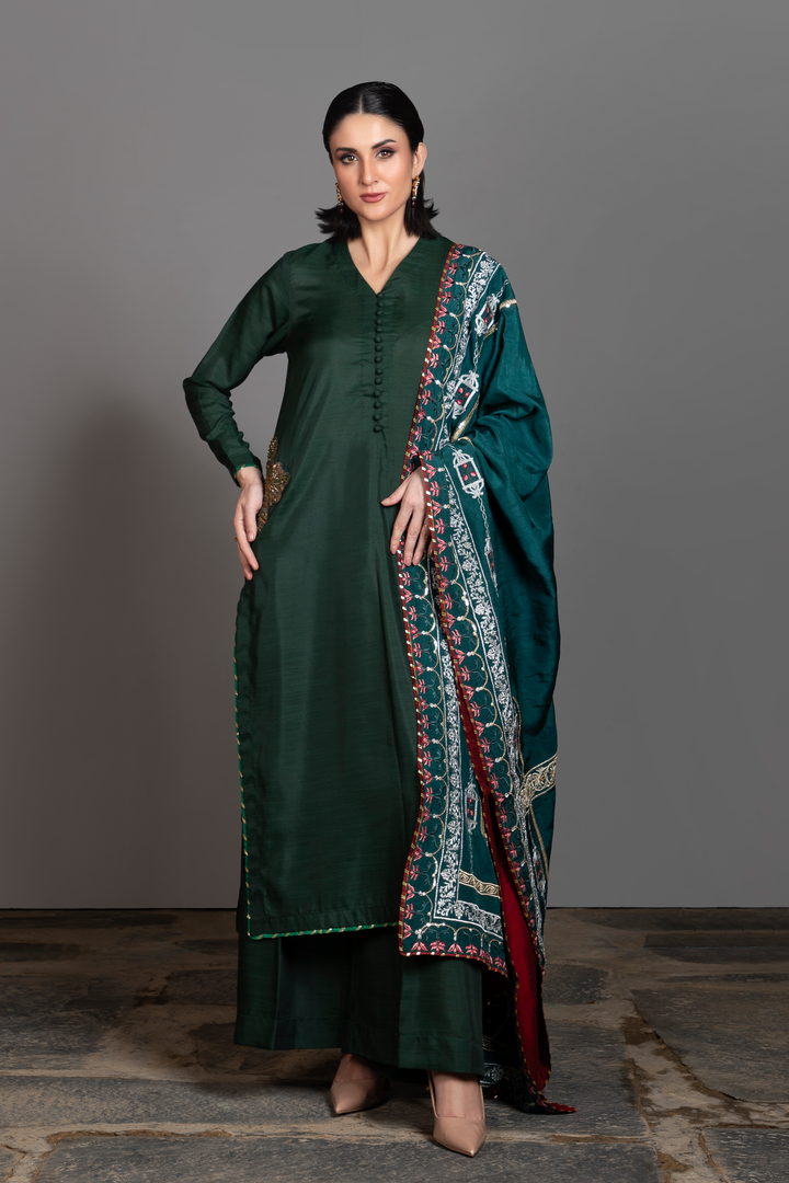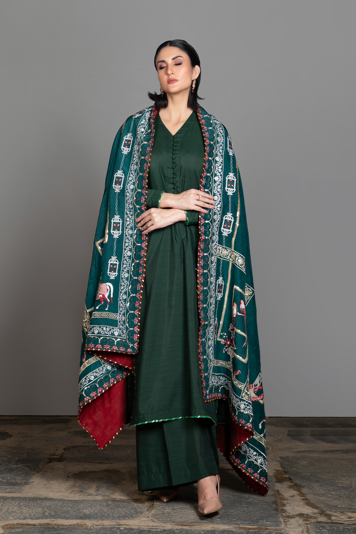 Anabia pairs a bottle green silk kurta and trousers with a beautifully crafted shawl in complementing tones. The kurta features understated embroidery along the neckline and sleeves, giving the silhouette a polished and graceful finish.