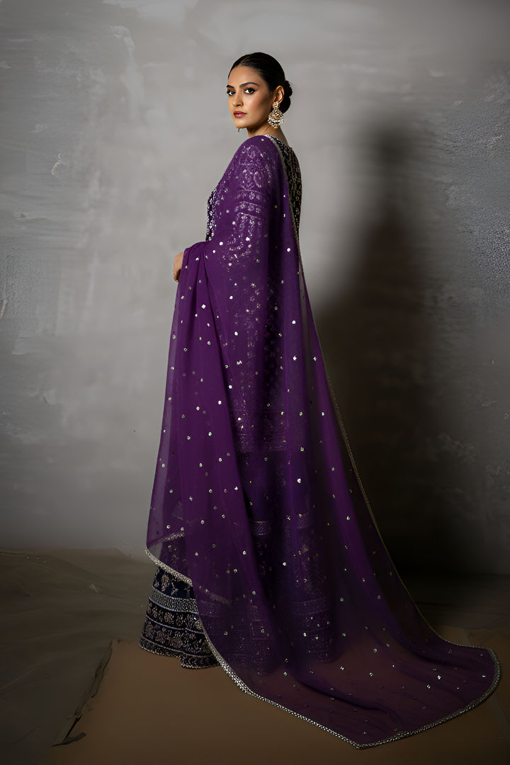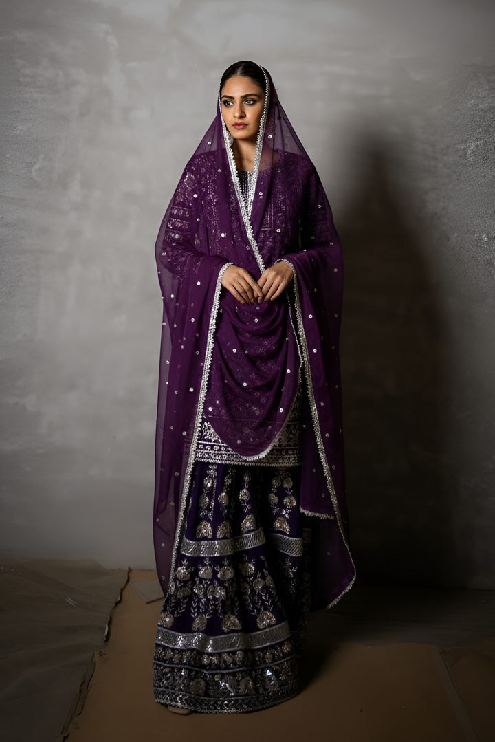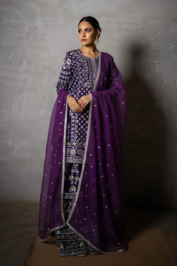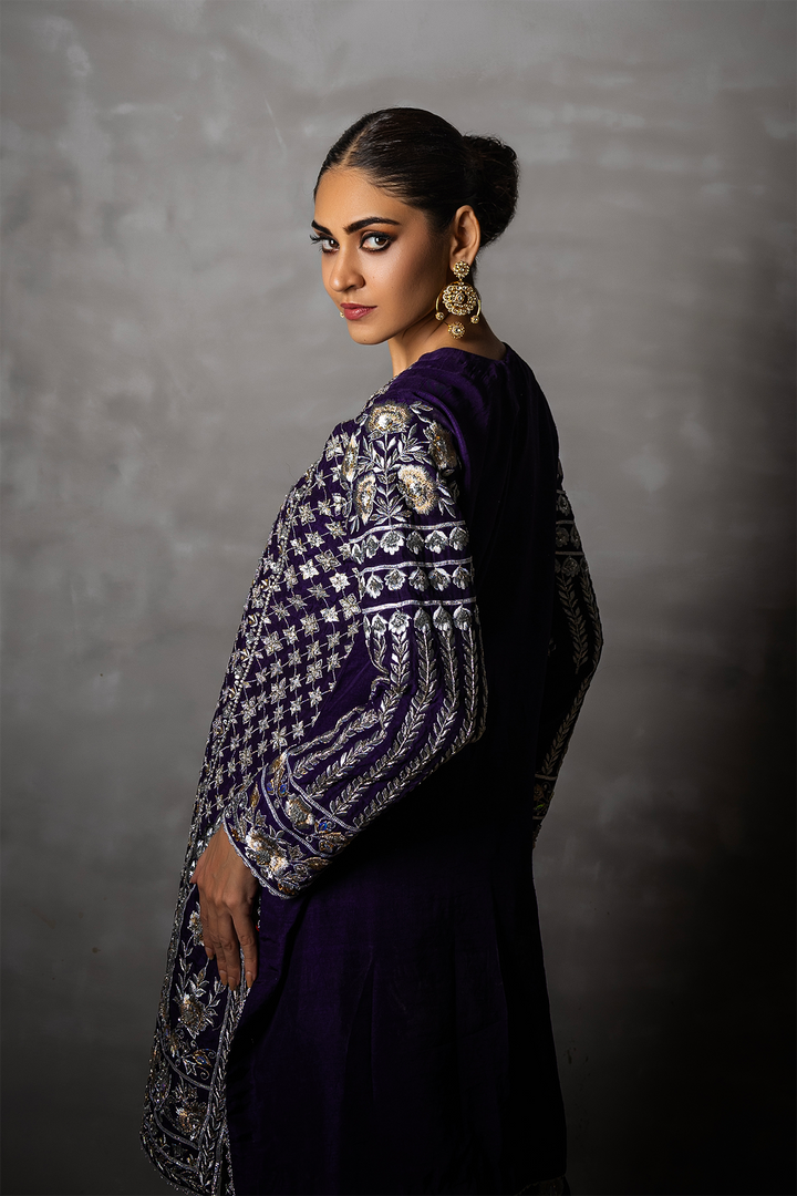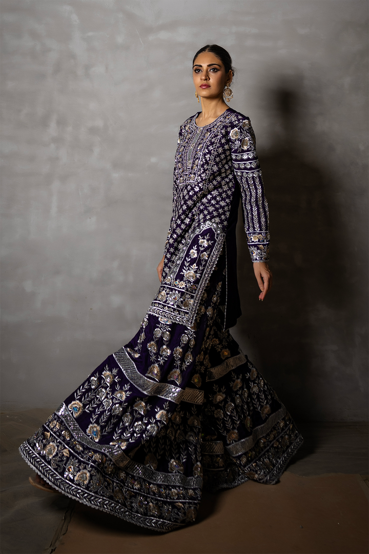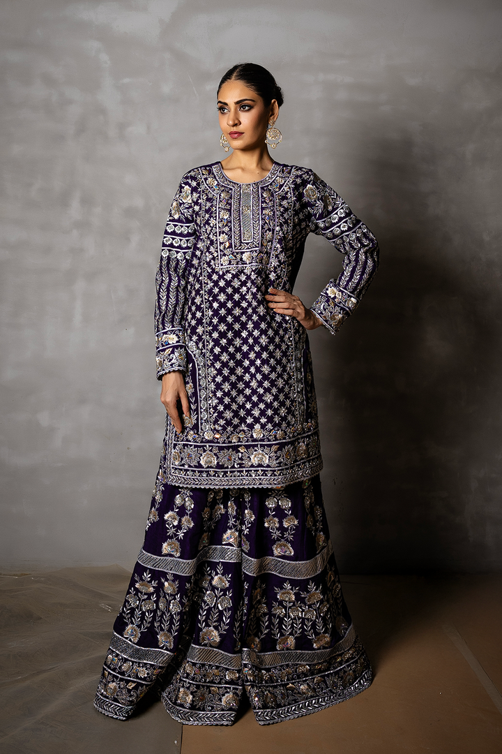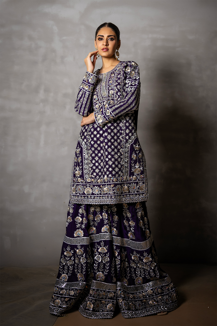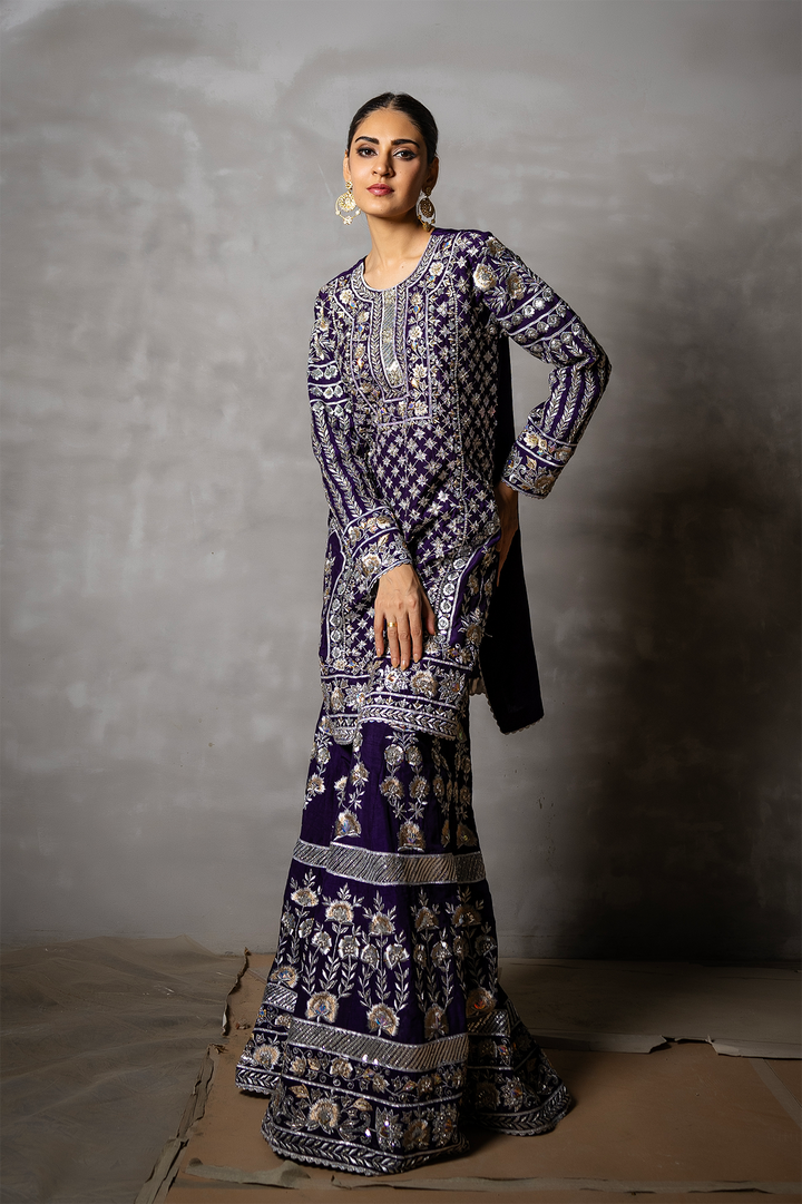 A bold jewel-toned sharara set in deep purple katan silk. The straight-cut shirt is richly embellished with resham, zari, sequins, and stone detailing, paired with voluminous sharara bottoms for a dramatic festive silhouette. Designed for the modern woman who seeks tradition with a statement edge.