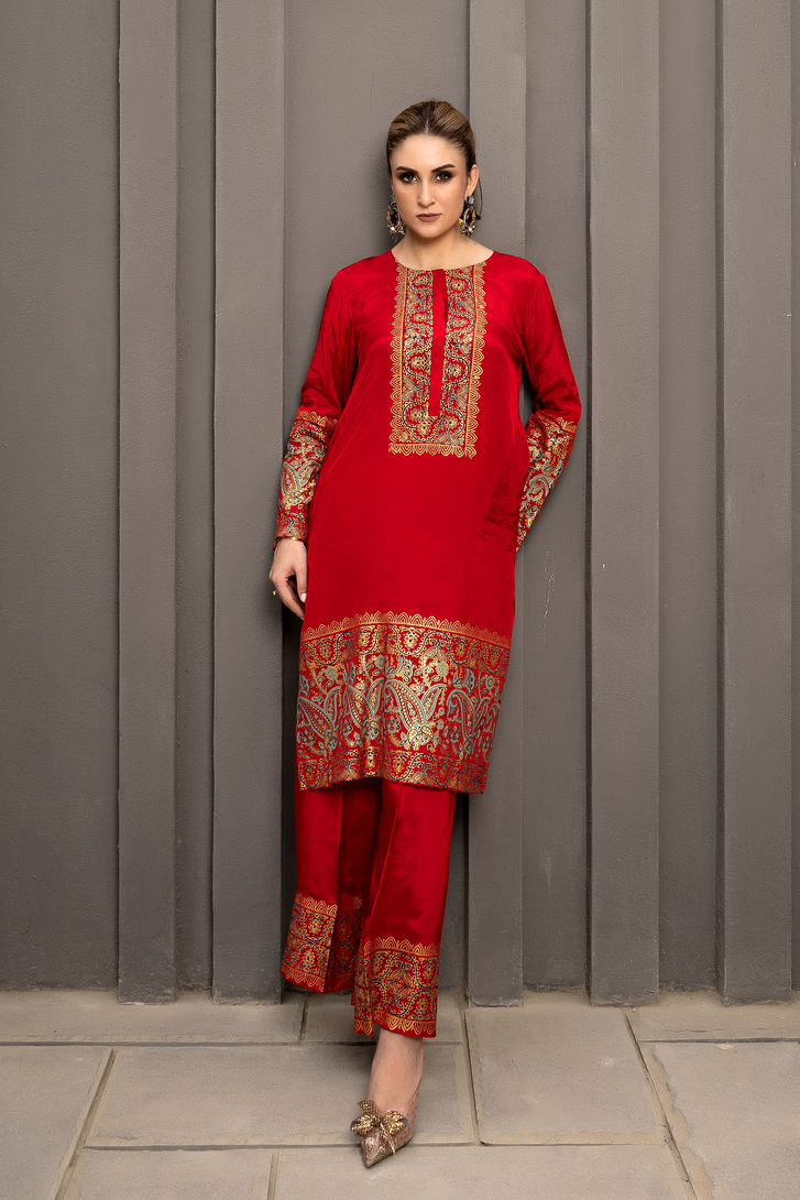A festive red ensemble enriched with traditional gold and turquoise block patterns. With intricate borders and a dramatic neckline, this suit is perfect for intimate celebrations and cultural moments.