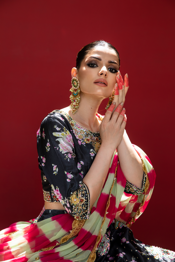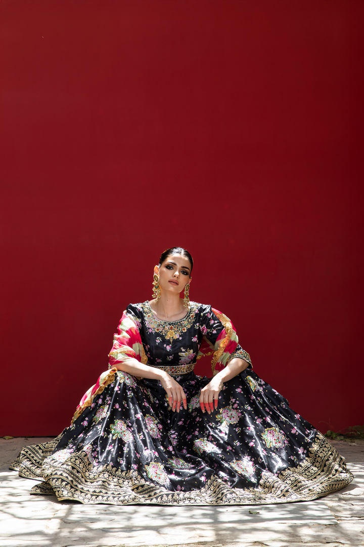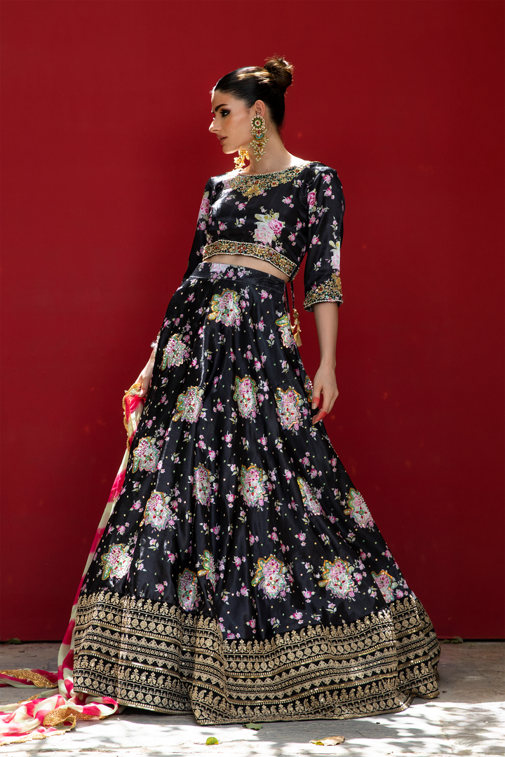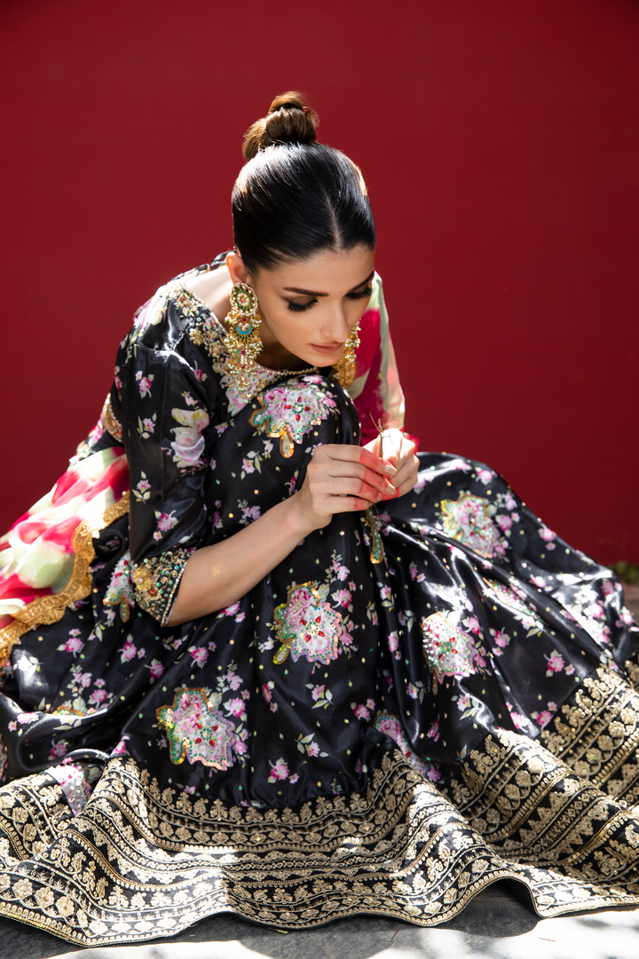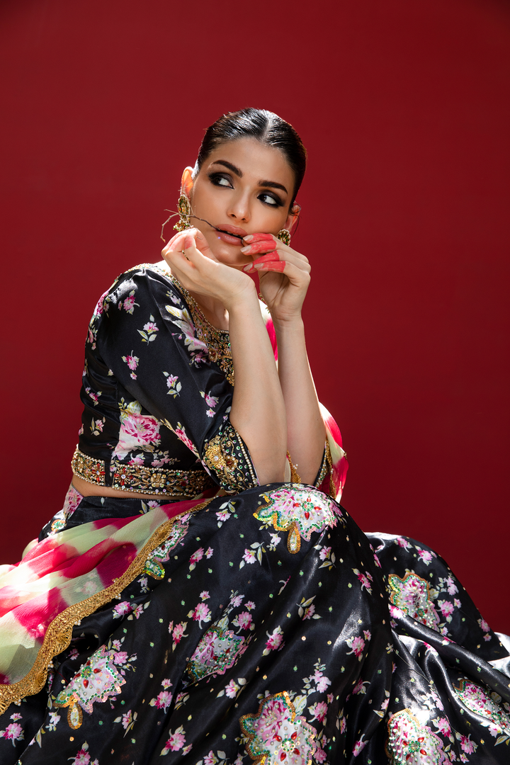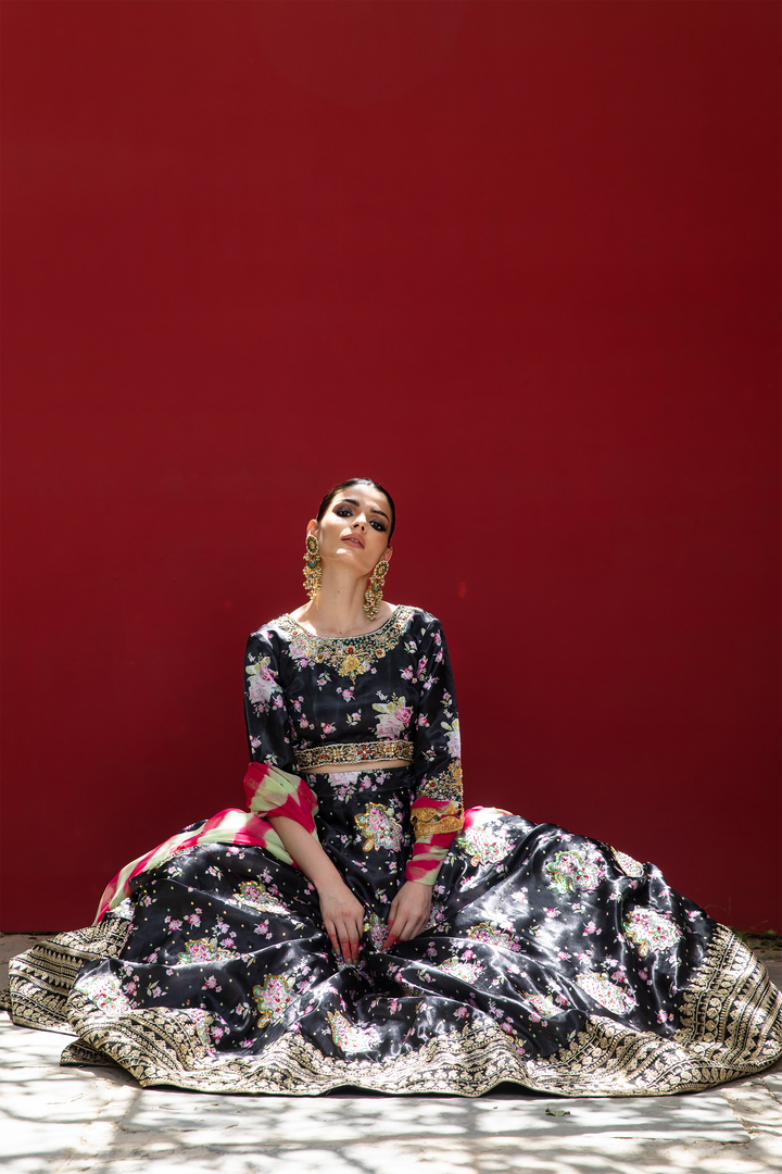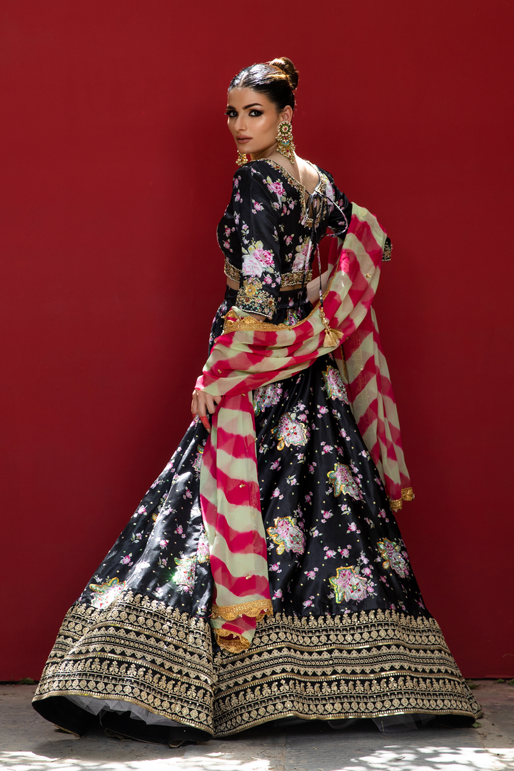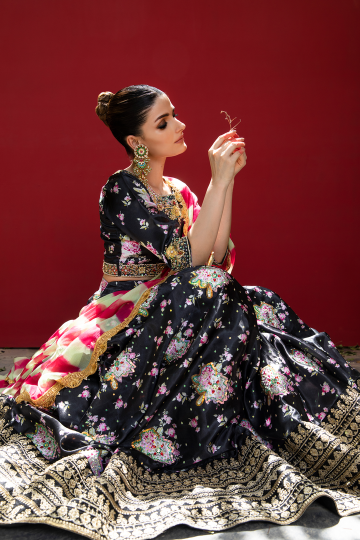 Bold, graceful, and exquisitely detailed, this Black Floral Digital Printed Silk Lehenga captures the essence of modern elegance infused with traditional artistry.