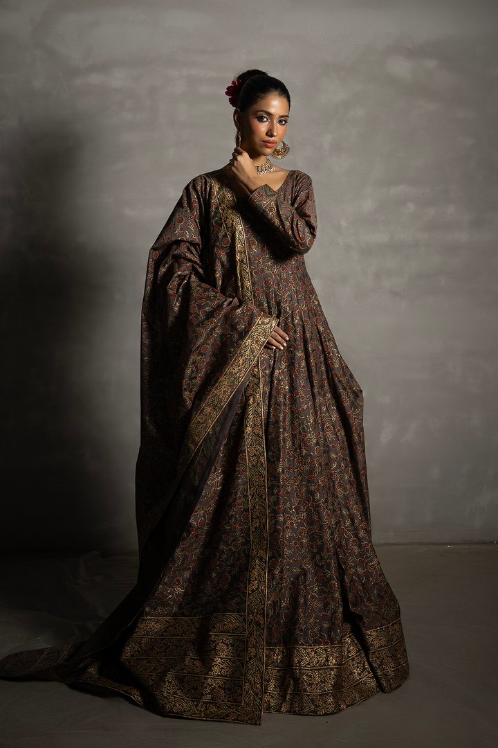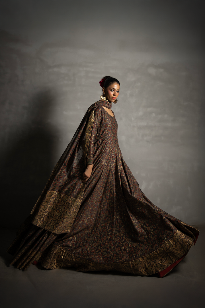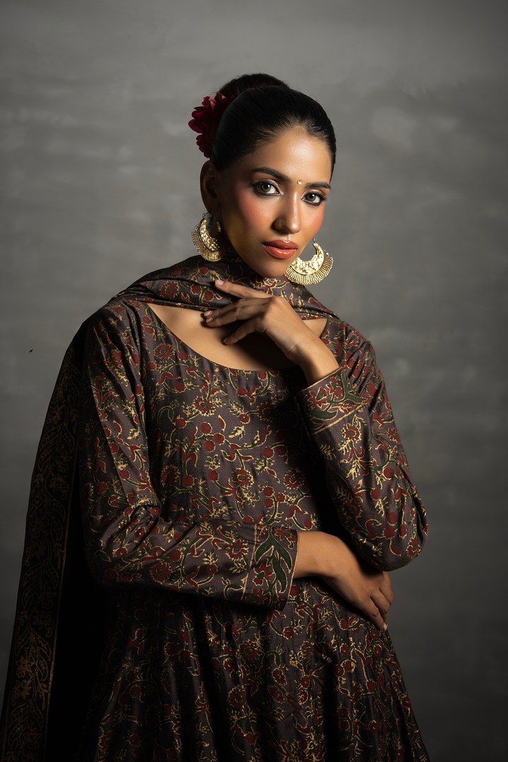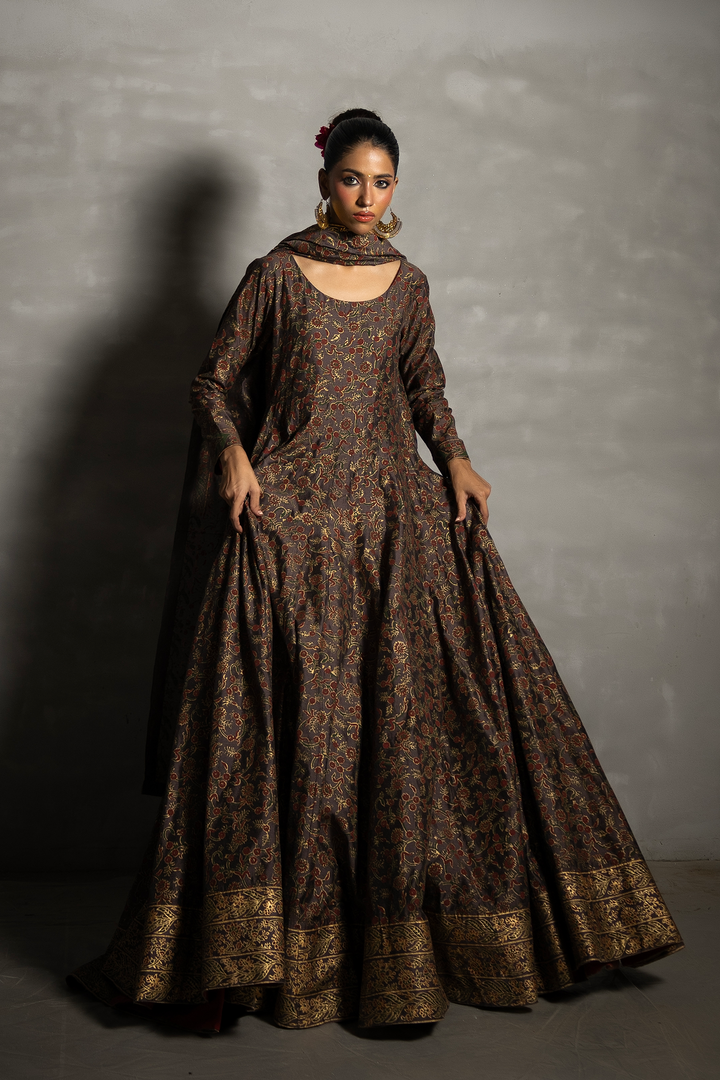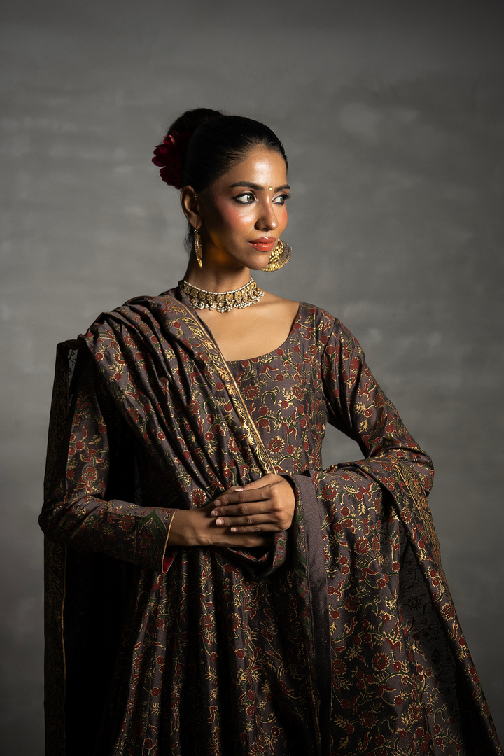 An earthy chestnut brown katan silk Anarkali, enriched with hand block prints inspired by Mughal florals. The full-length kalis create movement, while a refined neckline adds a touch of structure. Completed with a block-printed dupatta and optional matching katan silk straight pants, this ensemble is a nod to timeless heritage wrapped in elegance.