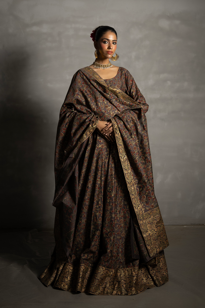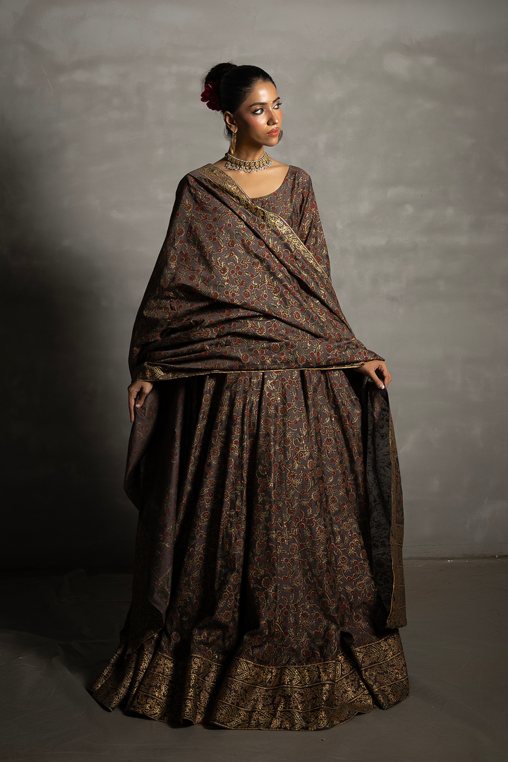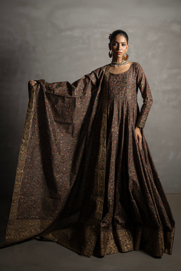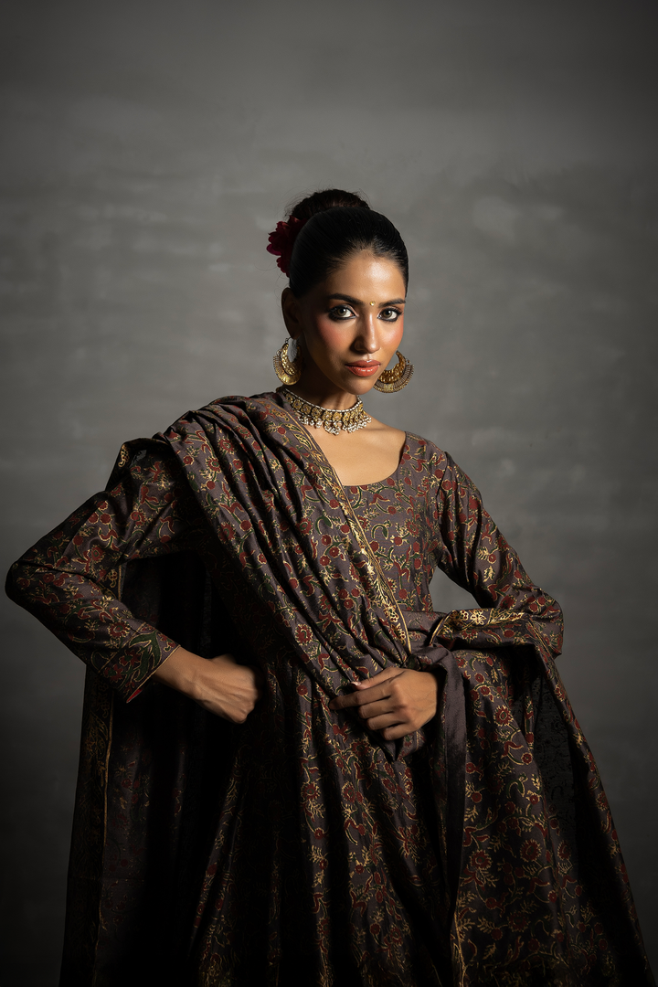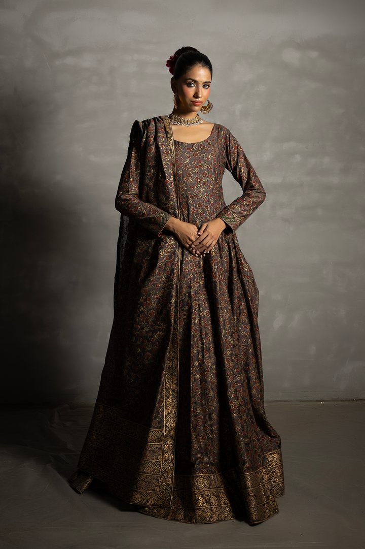 An earthy chestnut brown katan silk Anarkali, enriched with hand block prints inspired by Mughal florals. The full-length kalis create movement, while a refined neckline adds a touch of structure. Completed with a block-printed dupatta and optional matching katan silk straight pants, this ensemble is a nod to timeless heritage wrapped in elegance.