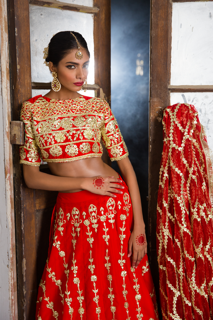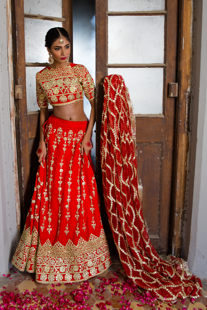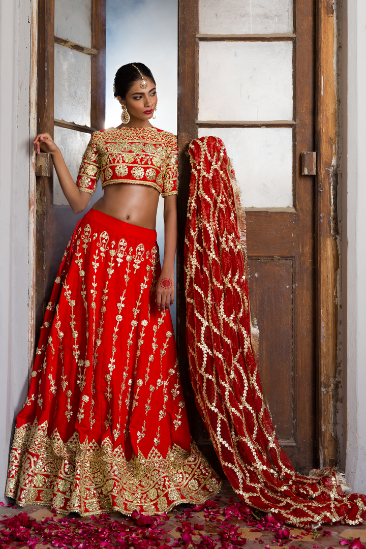 A timeless red bridal look crafted in luxurious raw silk and finished with traditional gota detailing. The rich color and classic embellishment create an elegant and graceful bridal presence.