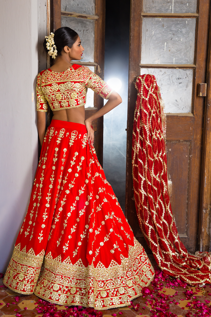 A red raw silk lehenga adorned with gota work along the hemline and integrated gota embellishment all over. The traditional detailing enhances the flare and adds richness to the silhouette.
