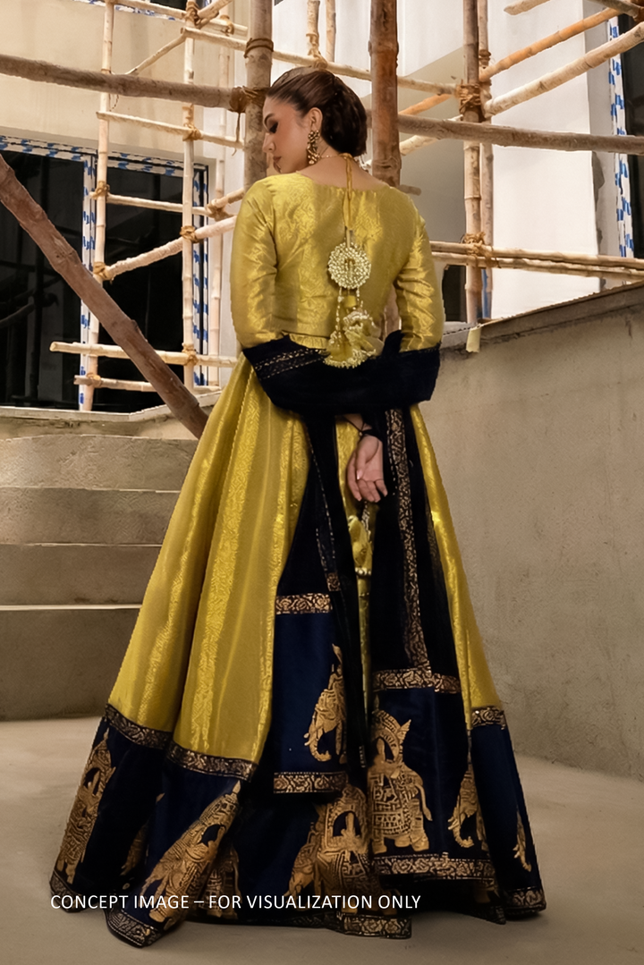 A golden tissue fabric Anarkali designed with navy borders and traditional elephant motifs, crafted in a regal yet contemporary style. The look is elevated with a sheer cotton net dupatta featuring artisanal block printing. Sleeves can be added upon request, while optional slim straight Katan Silk pants are available to complete the ensemble.