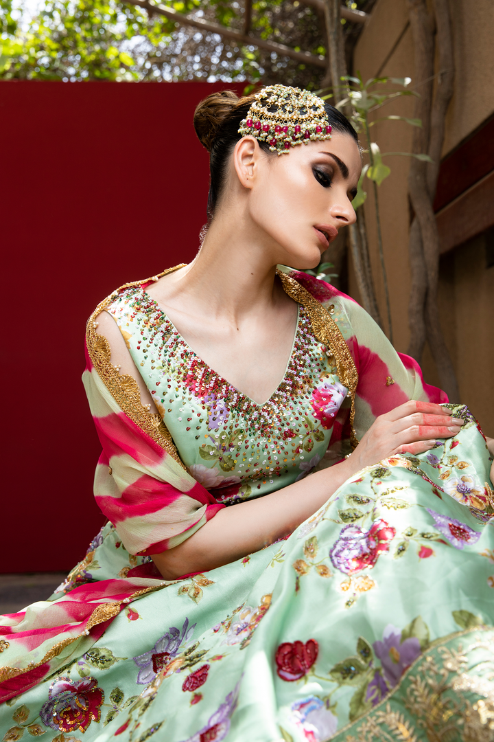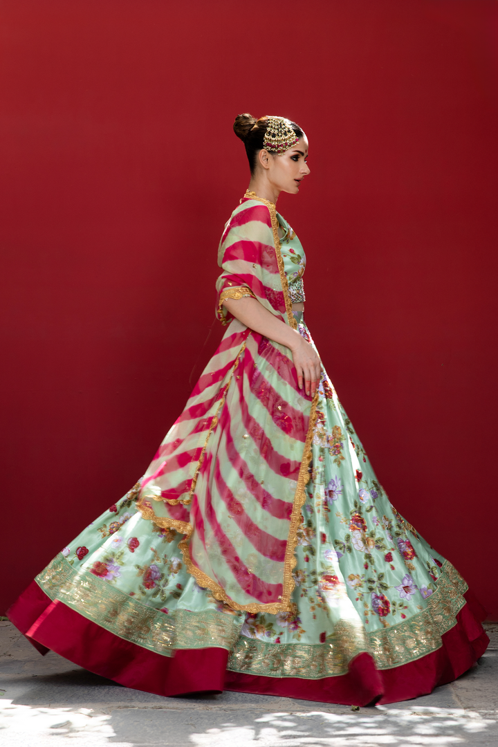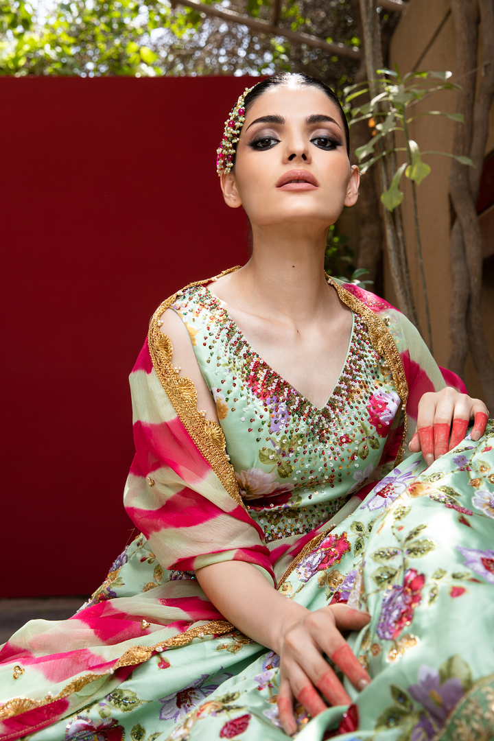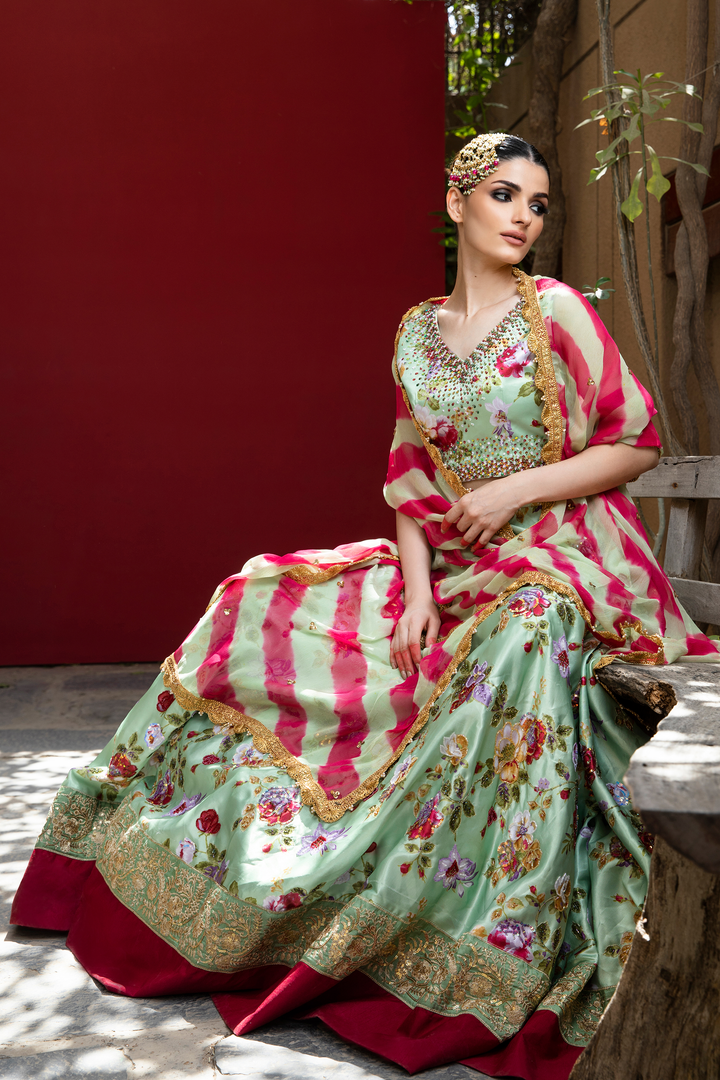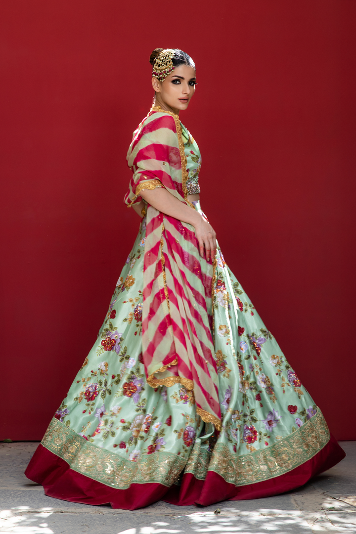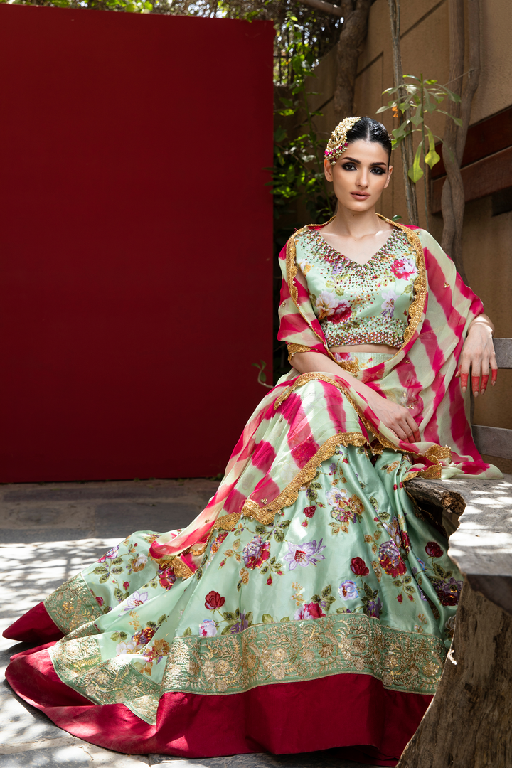 Lehenga: Silk – Mint Green (Floral Digital Print)