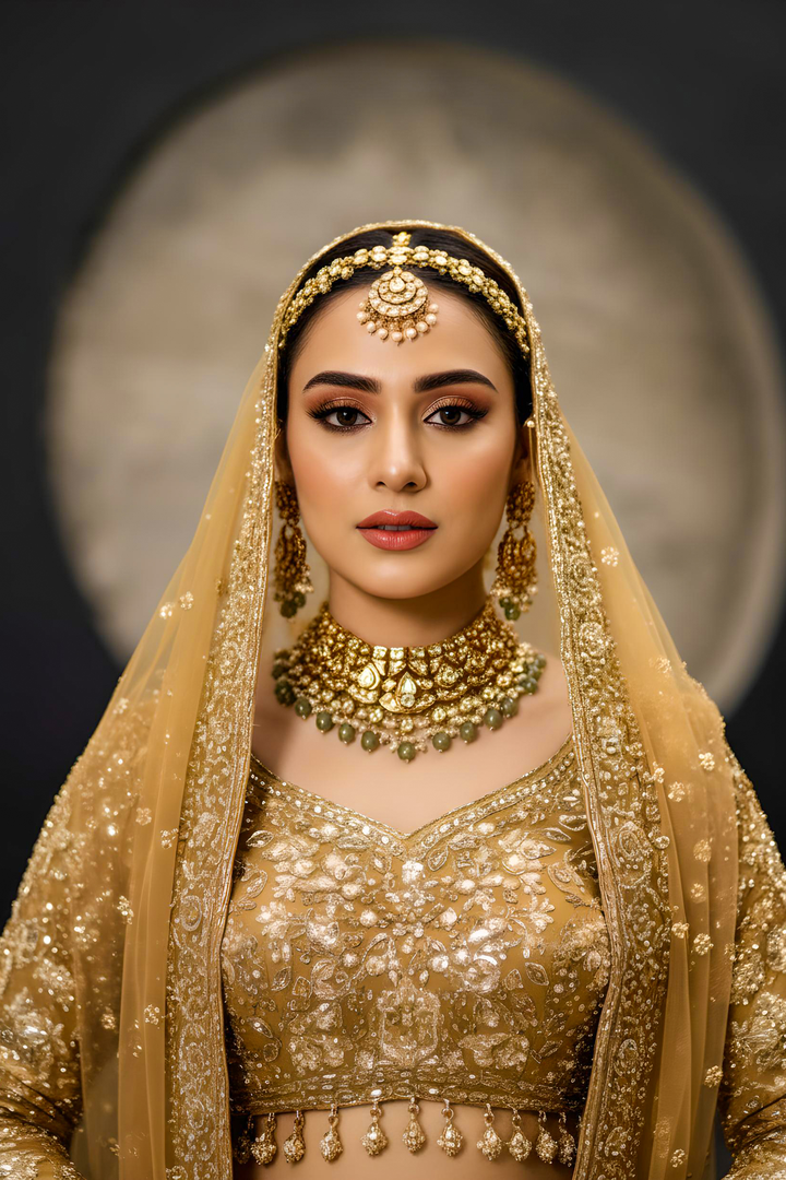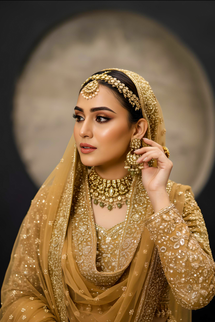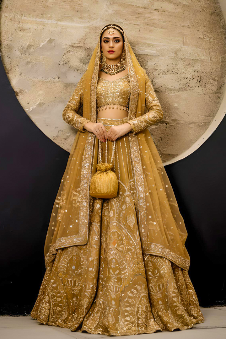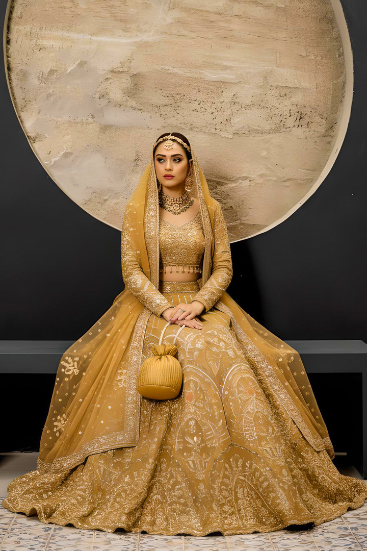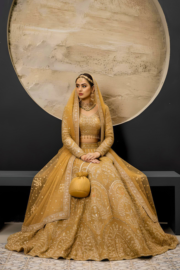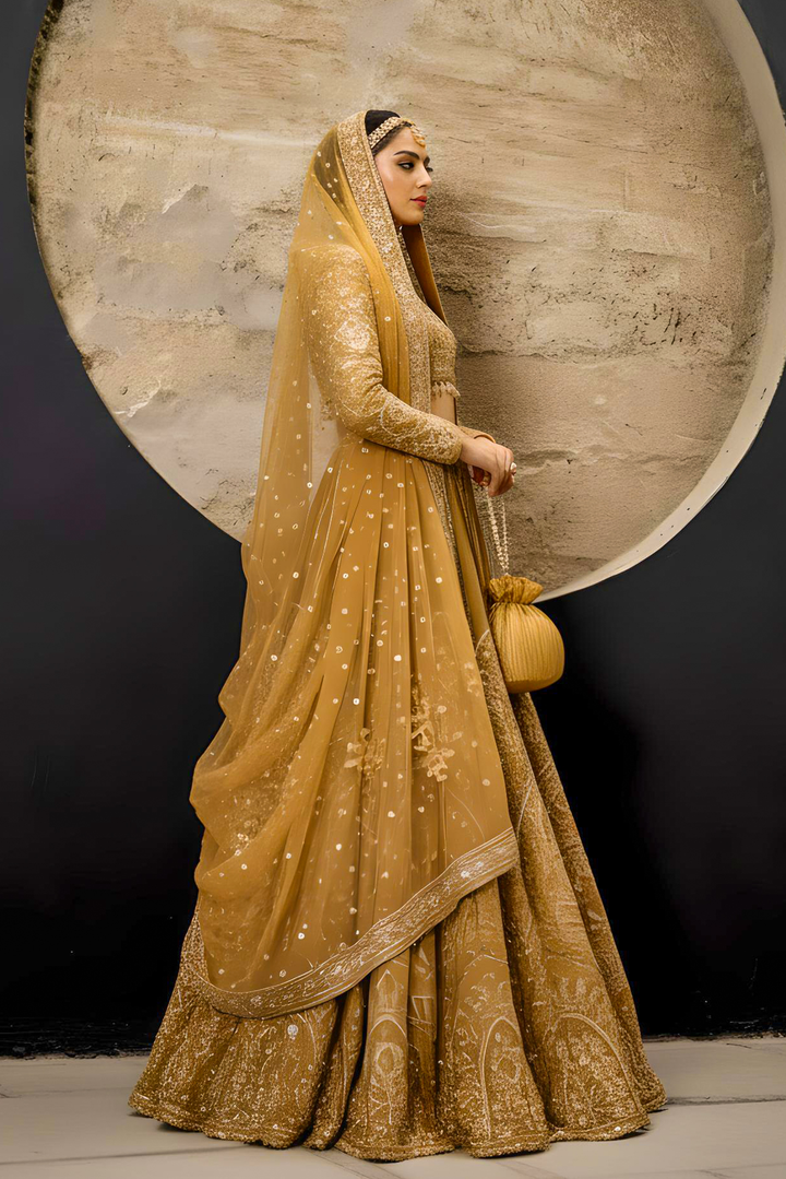 A luxurious golden bridal ensemble ideal for the wedding day, designed to deliver a regal and timeless look.
