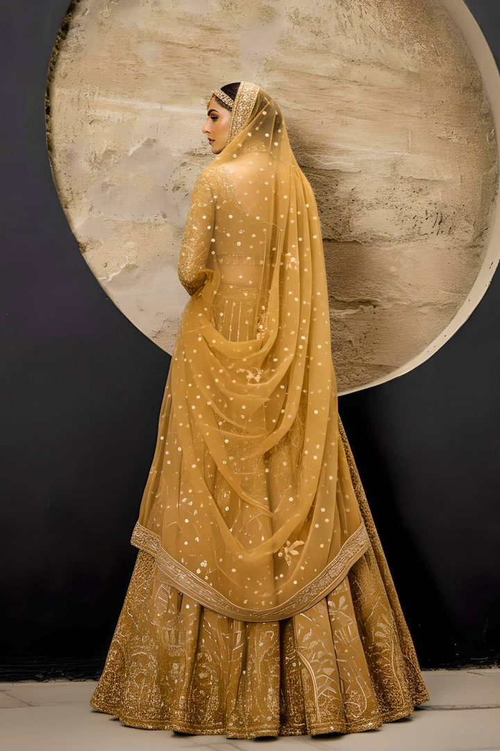 A radiant golden bridal masterpiece designed to create a regal and graceful presence. The rich raw silk base paired with intricate hand embellishment brings together luxury, tradition, and timeless elegance in one stunning look.